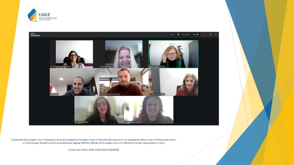 По време на срещата екипът: Обсъди последните финални корекции по продуктите на проекта, по-специално Доклада за въздействието. Прегледа финалните събития, проведени в страните партньори и сподели ценна обратна връзка, събрана от участници и заинтересовани страни. Планира процеса по подготовката на Финалния отчет както и координацията на предстоящите стъпки и отговорности. Обсъди устойчивото бъдеще на резултатите … Продължете с четенето на Партньорите по проекта EAGLE Erasmus+ се срещнаха онлайн за важна координационна среща, тъй като проектът навлиза във финалната си фаза!