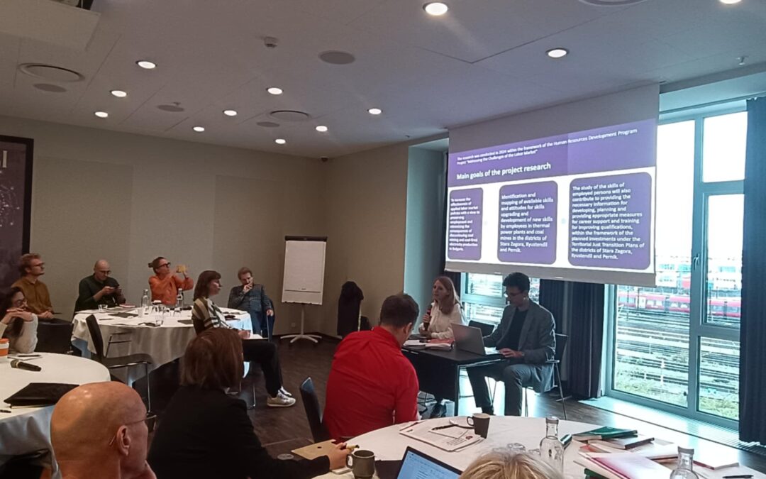 През втория конферентен ден г-жа Макелова и г-н Божилов представиха мащабно изследване на КНСБ с участието на ИССИО, проведено през 2024 г. в рамките на Програма „Развитие на човешките ресурси“, проект „Адресиране на предизвикателствата на пазара на труда”. Изследването е сред наетите лица във въгледобивните компании в България и топлоелектрическите централи, ползващи се от добитите въглища. Основните резултати от изследването целят подпомагане на правителствените политики на пазара на труда за запазване на заетостта в изследваните предприятия по време на зеления преход.